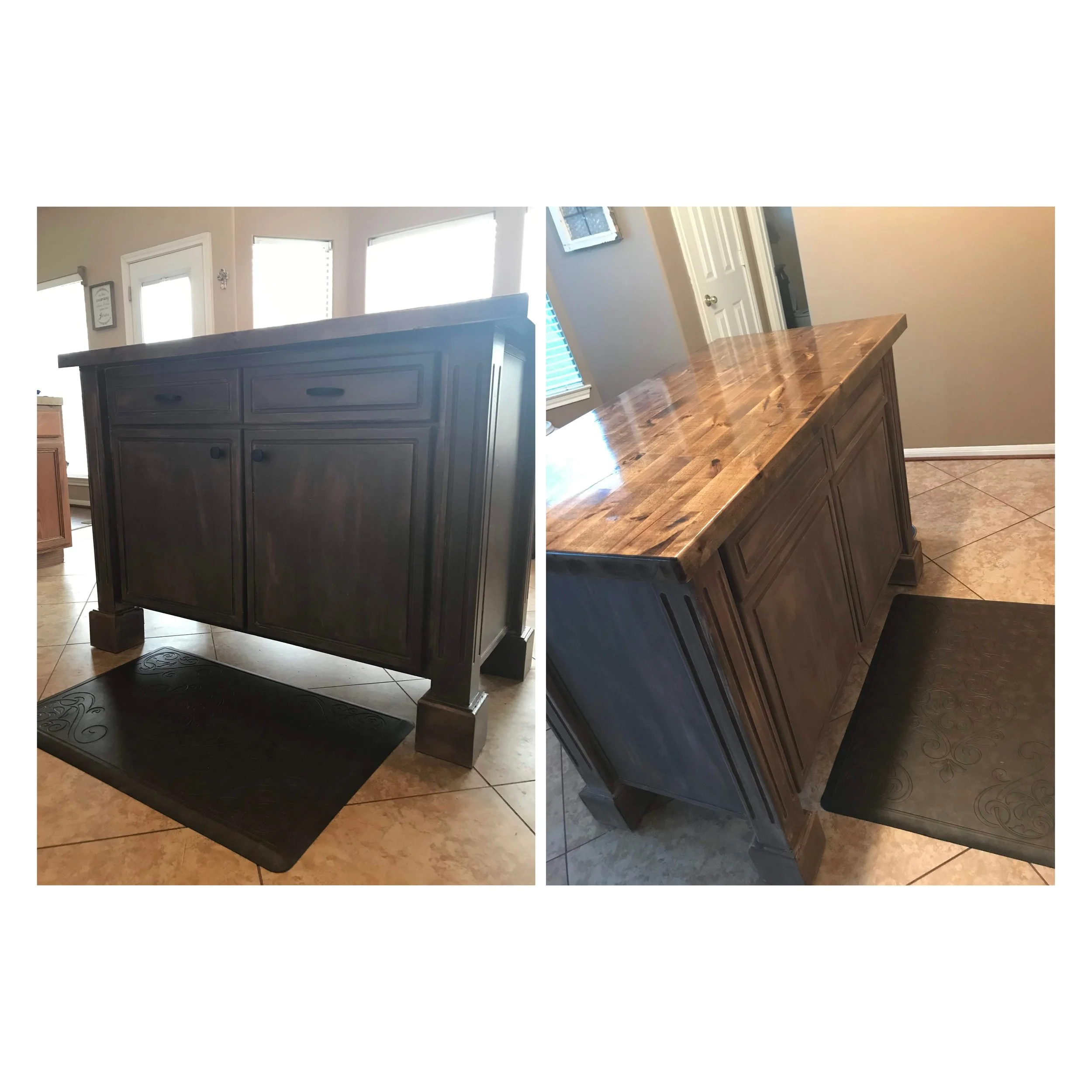 He spent time carefully preparing for this project, and finally began his journey of measuring, cutting, nailing, and screwing together each piece as if it was a puzzle. After applying the final coat of Clear Gloss Polyurethane, Marvin walked around his FINISHED creation several times, peering at the reflection as the shop light glistened off the clear coated butcher block top. Struck with amusement, he stared at the pristine corners and designs that proved to have been accomplished by someone with masterful craftsmanship in woodworking. With such a feeling of joy and excited, he paused for a moment, and said to himself “I did that.”